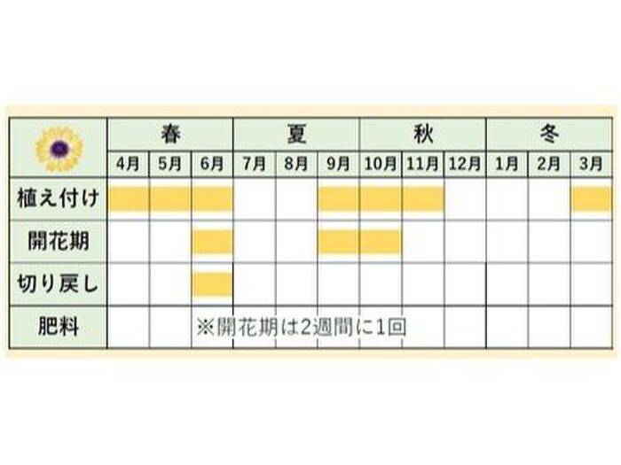 高温多湿に弱いため、夏が来る前に株の1/3ほどの長さに切り戻し、花柄も摘み取っておきましょう。思いきって切り戻してあげることで、風通しが良くなるだけではなく、翌年、たくさんの花を付けてくれるようになります。冬場でも−5℃までなら耐えられるので、冬越しは可能です。ただし、霜には注意が必要です。