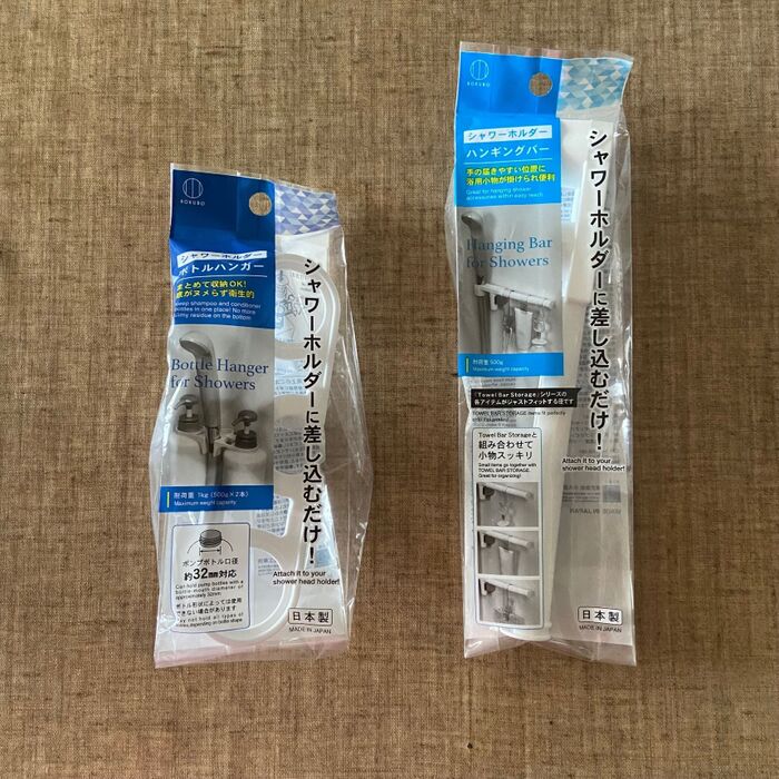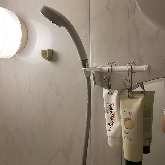 ハンギングバーにはS字フック式のものを引っかけることができます。洗顔料やトリートメント、石鹸などが収納できますよ。こちらも浮かせて収納!!