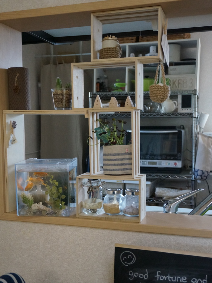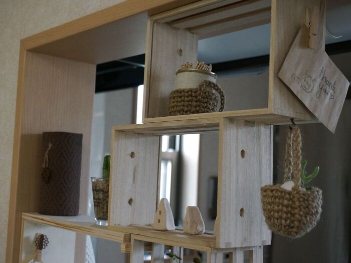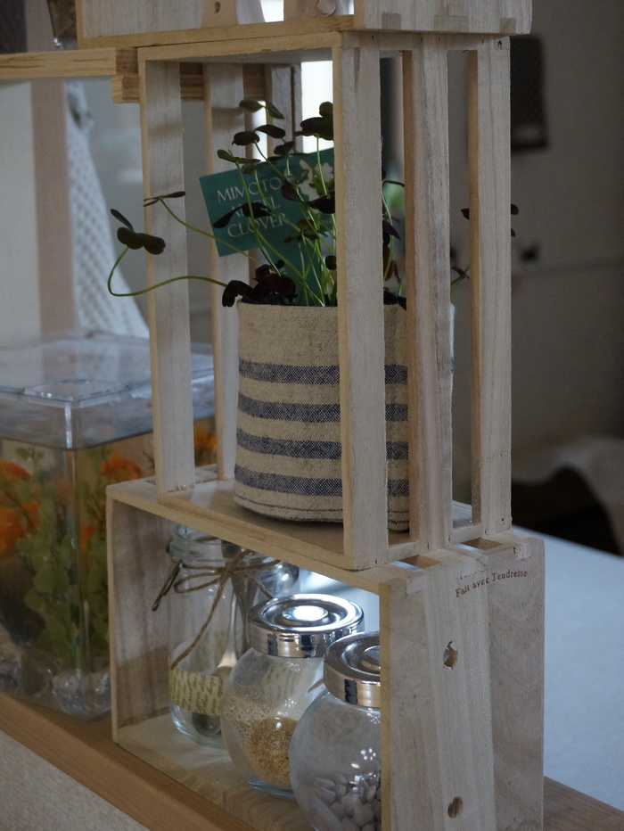 少しずつ木箱をズラすことで、cafe風な棚になりました。