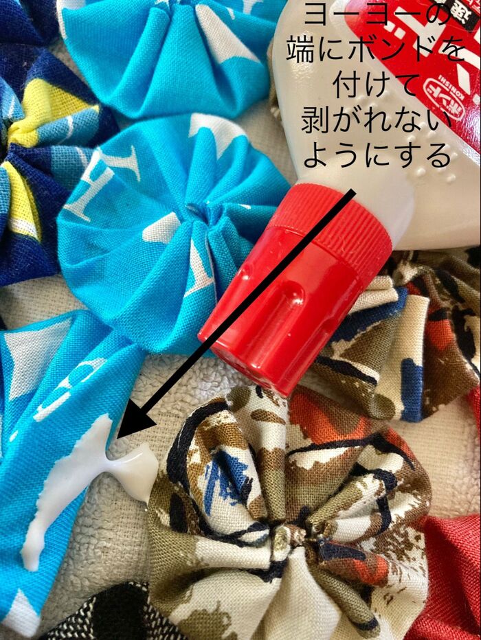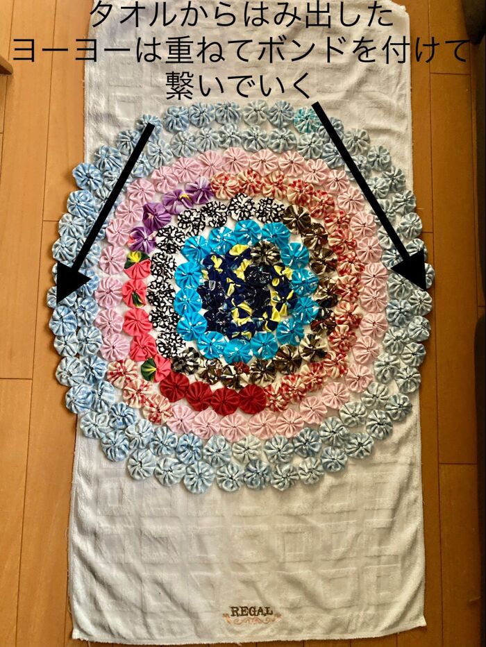 タオルからはみ出すヨーヨーは、ヨーヨー同士を5ミリぐらい重ねて多めのボンドで貼り付け繋ぎあわせます。