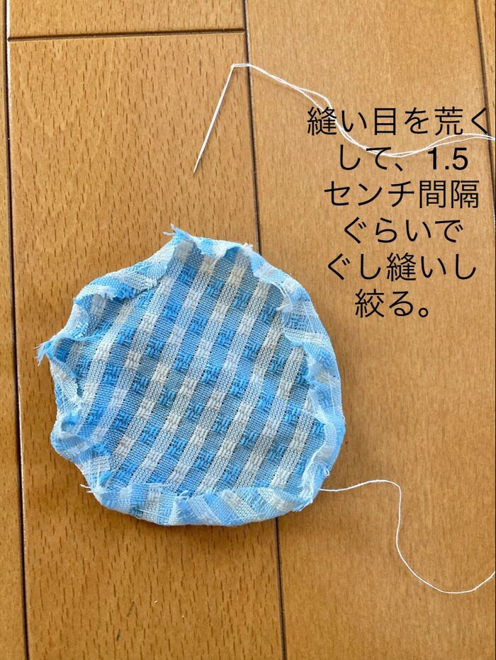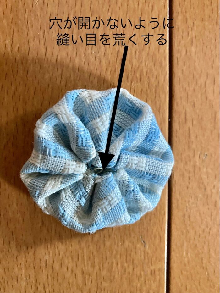 1.5センチ間隔ぐらいの荒目のぐし縫いにすると、真ん中の穴か開かずに作れるようです。