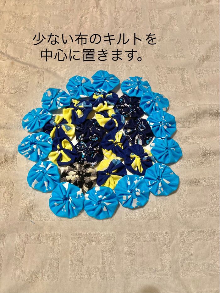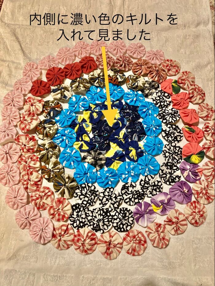 色の濃いブルー系を中心にし、同じ布で数が多いキルトは、大きい円ができるので、外側に付けてみました。