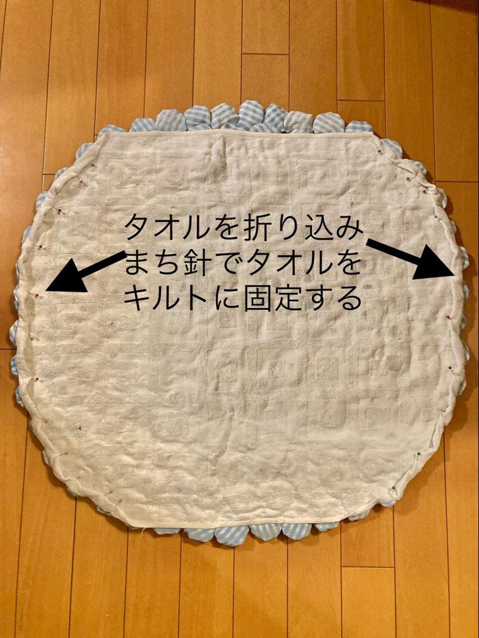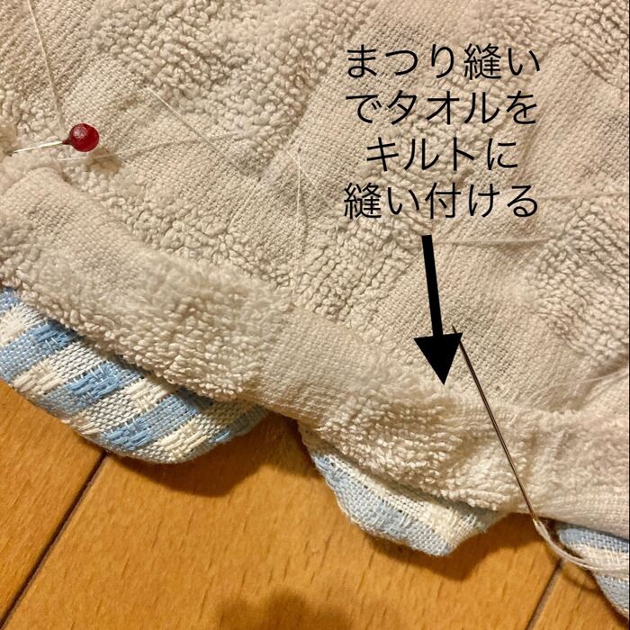 キルトからはみ出しているタオル部分を縫い代2センチ残してカットして、縫い代部分は、内側に織り込んでまつり縫いで縫い付けます。