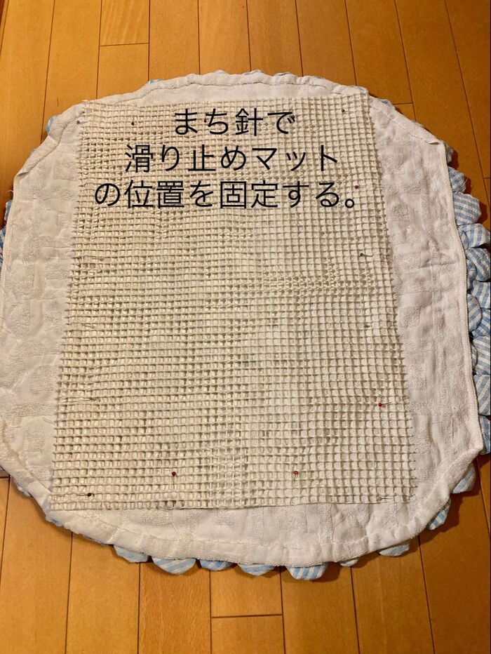 滑り止めマットをキルトの裏側に中心を合わせて置きまち針で留め、まつり縫いで縫い付けます。