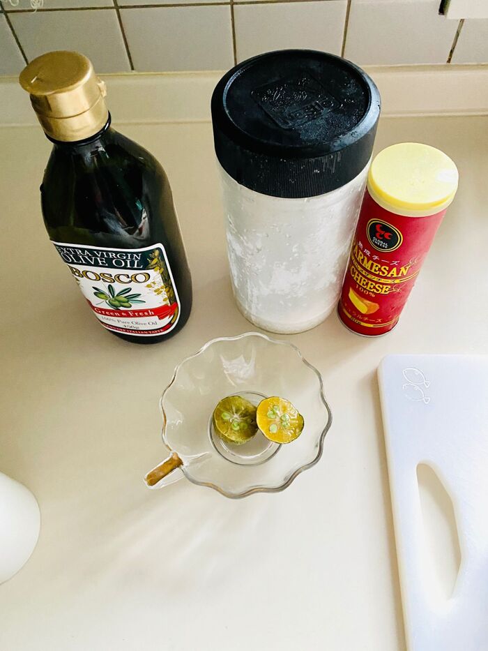 容器に、オリーブオイル、シークワーサーの絞り汁、パルメザンチーズ、塩を入れよく混ぜます。