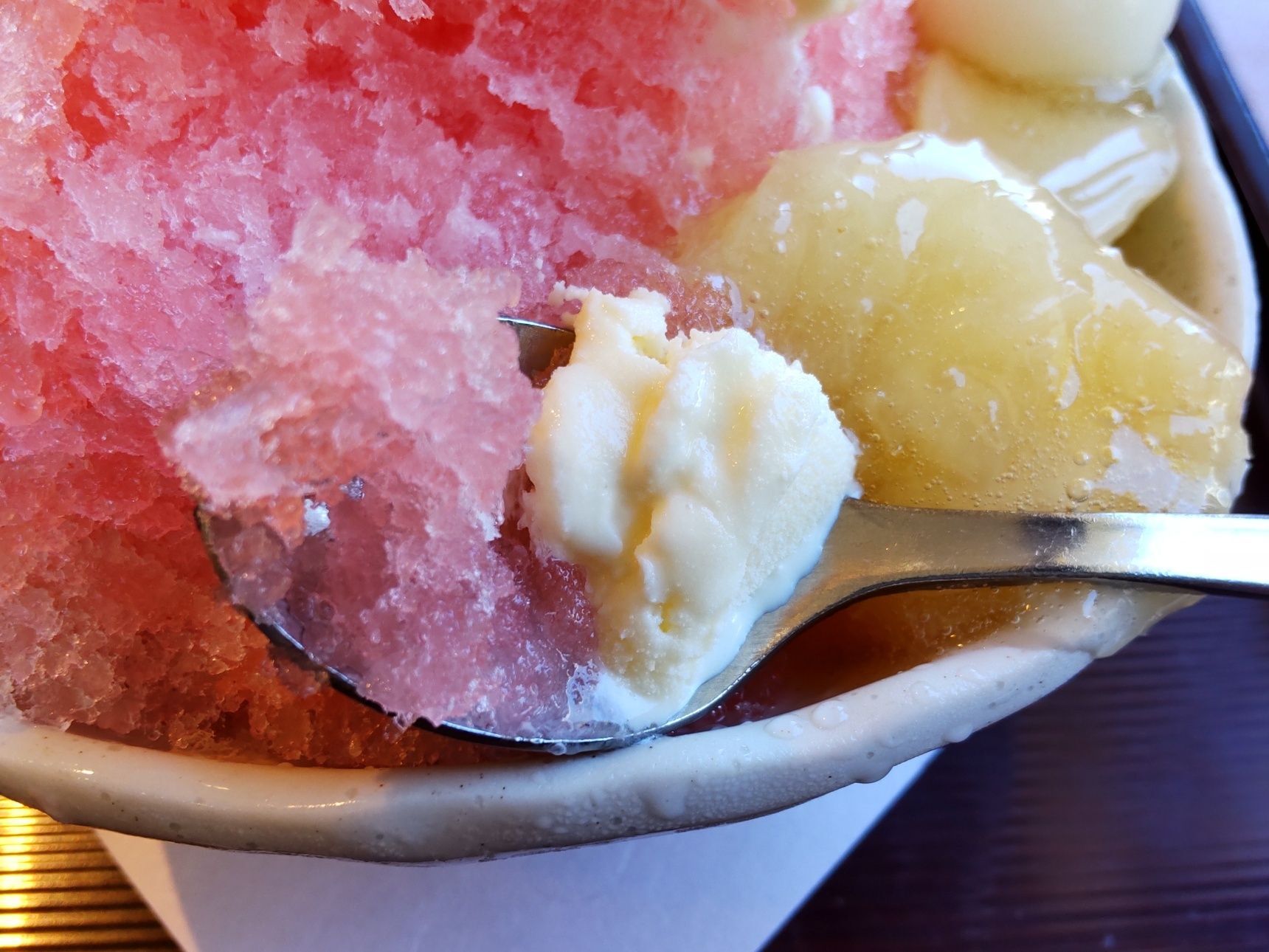 味見したんですが、シロップがしみ込んだかき氷とバニラアイスを一緒に食べると、さらに美味しいですね。