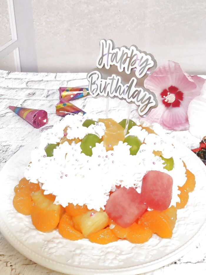 果物をどっさりトッピングして完成です。18cmのケーキに実際に挿してみたら、このようなかんじになります。