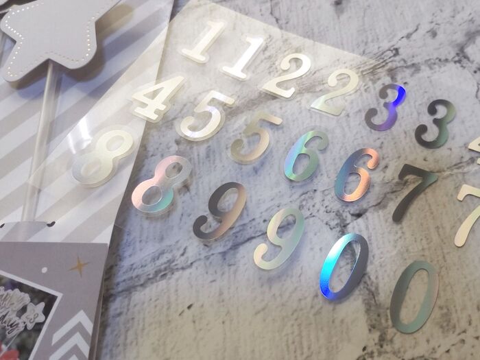 ハッピーバースデーの文字のピックと、年齢用のシールもついているんです。星モチーフの台紙に自分で貼ることができます。