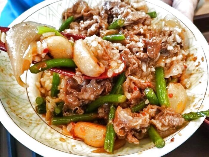 牛丼にピリ辛シャキシャキのにんにくの芽とホクホクのフライドにんにくが、トッピングされているピリ辛大人向け牛丼です。