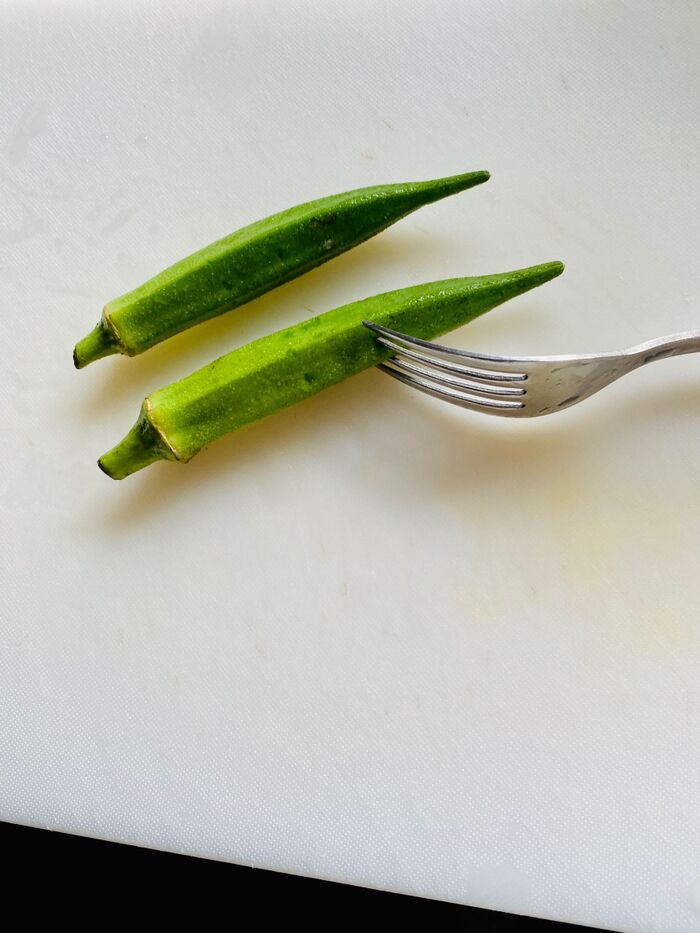 オクラは板ずりしてフォークでプチプチ穴を開けます。