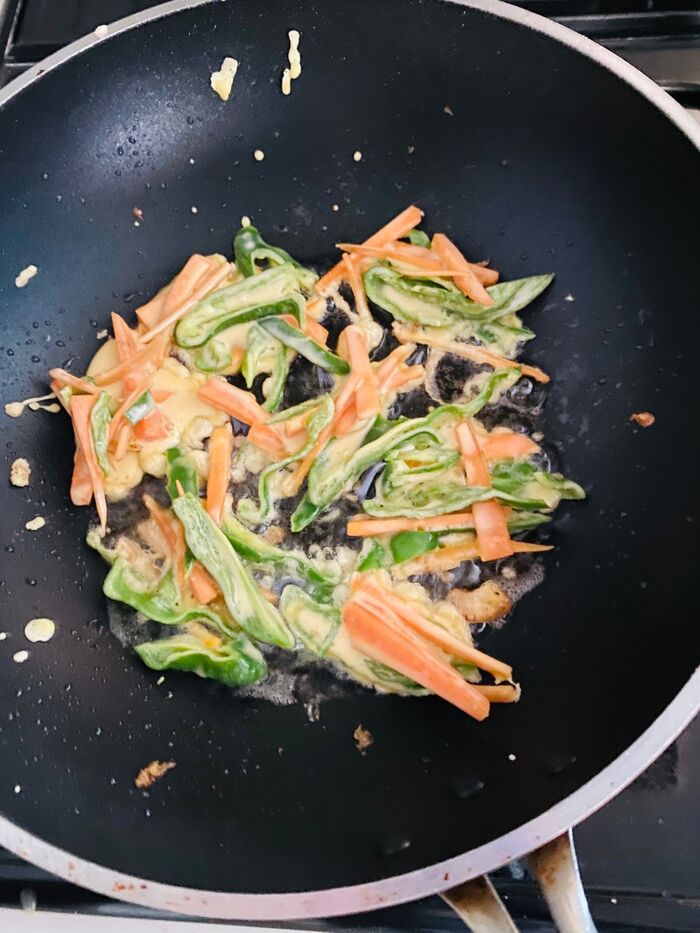 まだ衣が余っているので、にんじん、ピーマンでかき揚げを作りました。