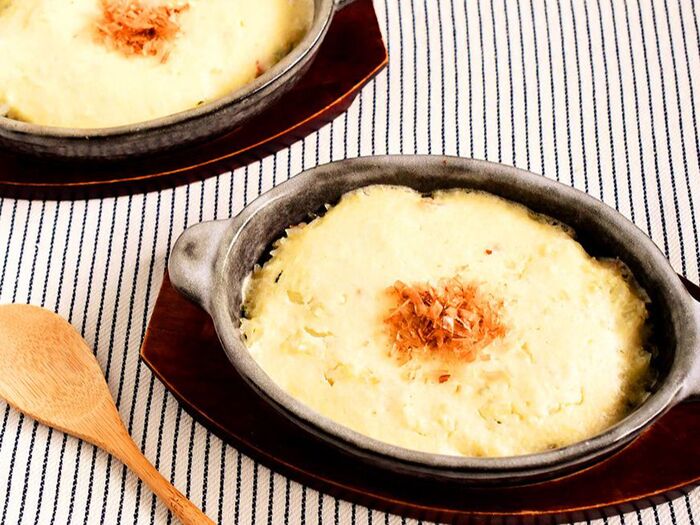 とろっとした長芋のホワイトソースに、香ばしいご飯が相性抜群の長芋のドリア。アクセントのかつお節が、ドリアを引き立てます。