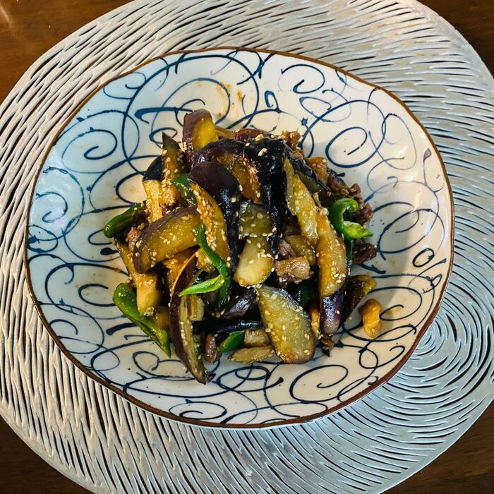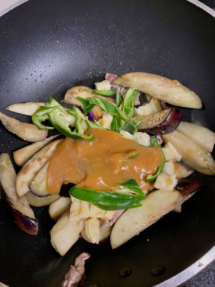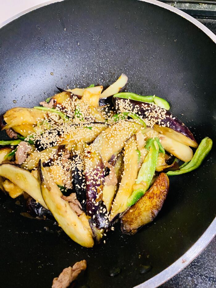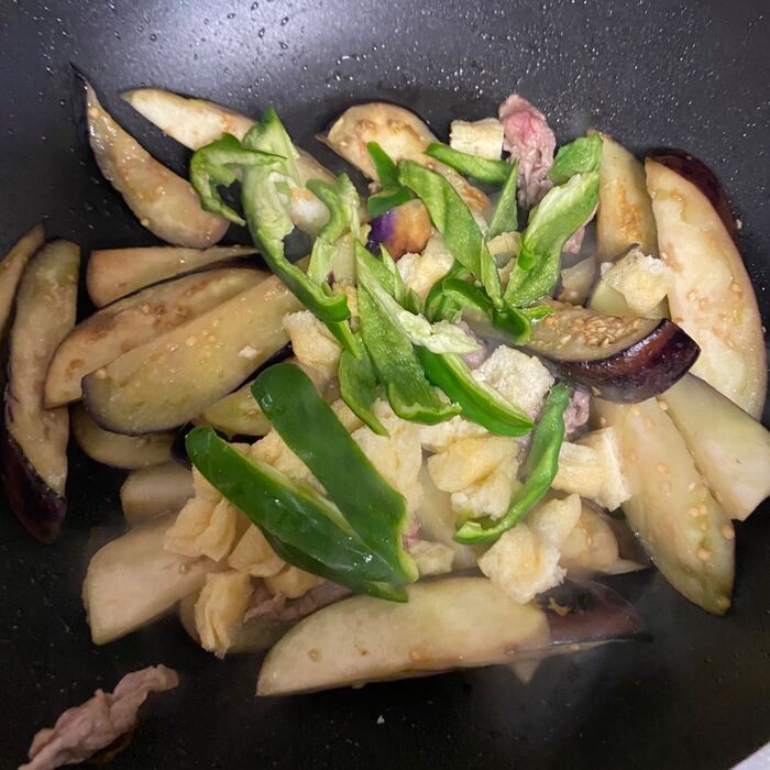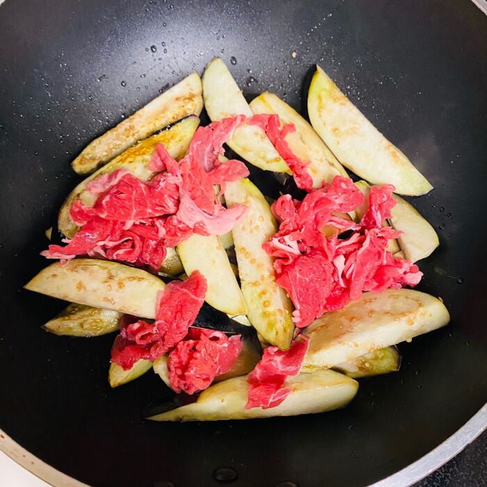 牛バラ肉は火が通りやすく、茄子は意外と火が通りにくいのので、先に茄子を炒めてから牛肉を加えますよ。