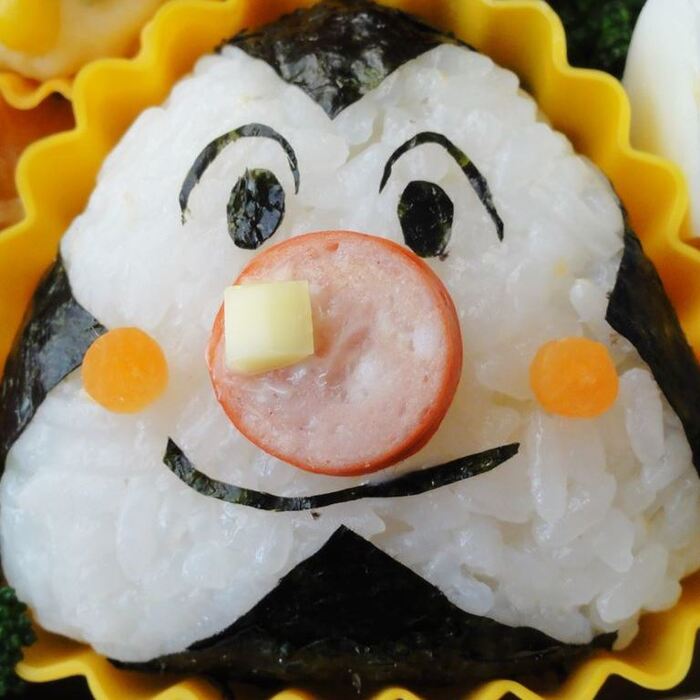 三角おにぎりに海苔、赤ウインナー、人参、チーズで各パーツを作って貼ります。人参やウインナーは乾燥スパゲッティで刺して固定します。