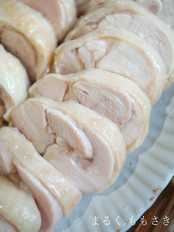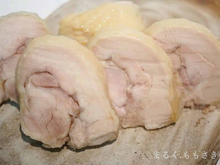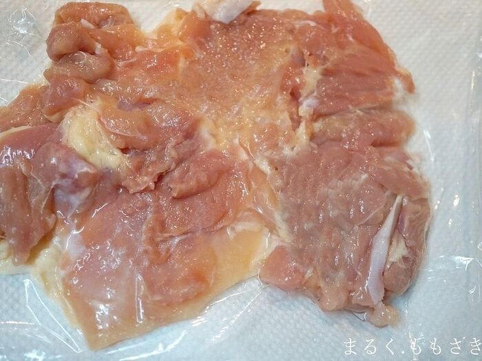 ①鶏もも肉は裏返し、厚みが均等になるように開く。