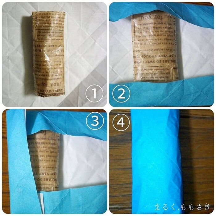 ※ラップが透明で分かりにくいので、2回目の巻き方の折り紙手順です。