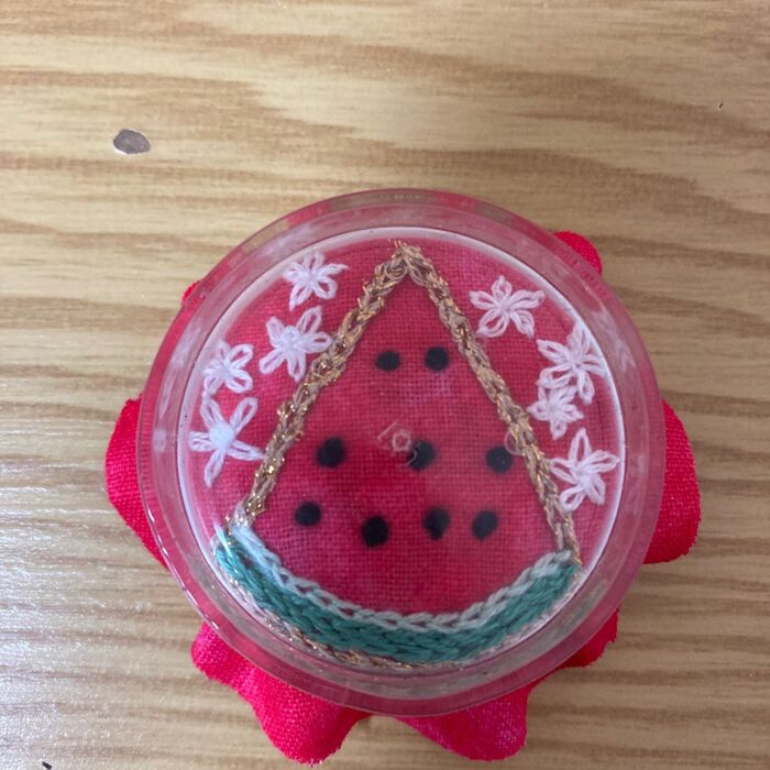緑、黄緑色の糸を使い、チェーンステッチでスイカの皮を刺繍します。