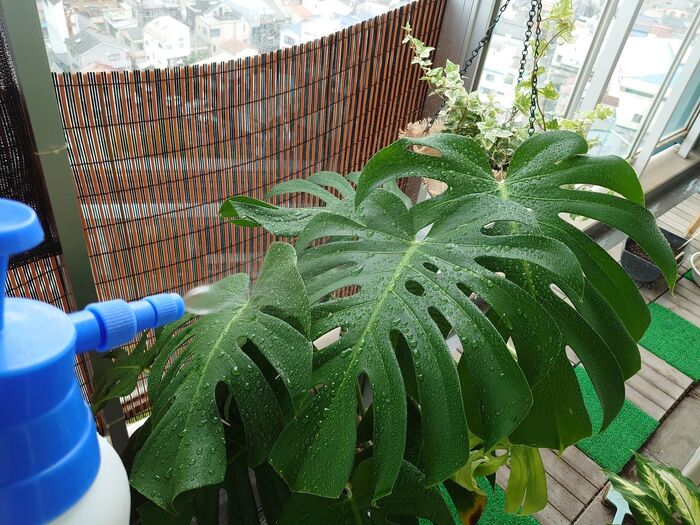 葉水の滴りが多くて、床やカーペットが濡れてカルキの結晶が固まるので、気がついたら拭き取らないと!