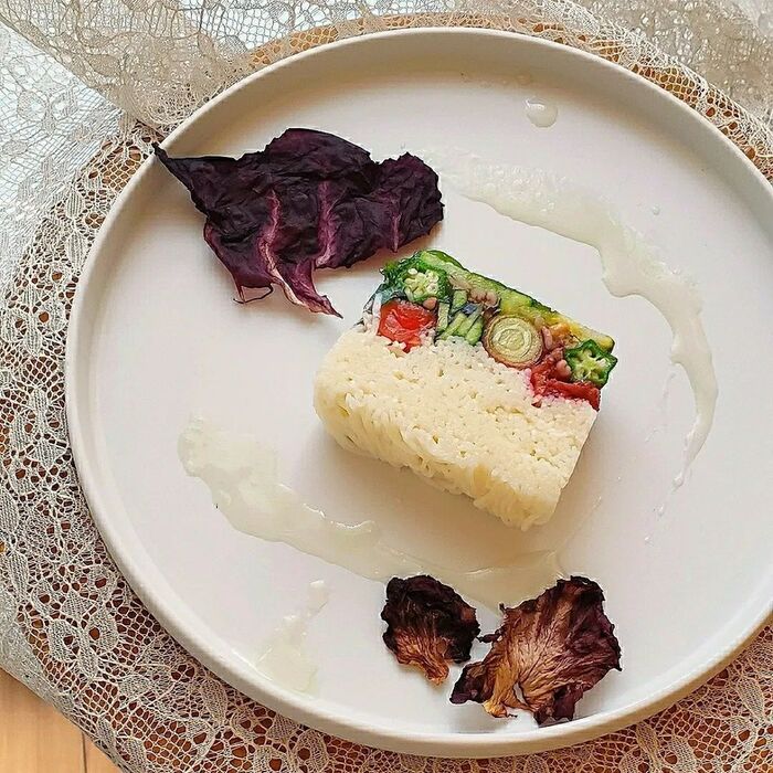 市販のゼラチンの水分量をそのまんまより、少し水分少なめゼラチン濃いめの1.5倍位にするとしっかりできカットもしやすいです。素麺部分の食感がフラットなので、野菜部分で食感を楽しくしてみて下さいね♪