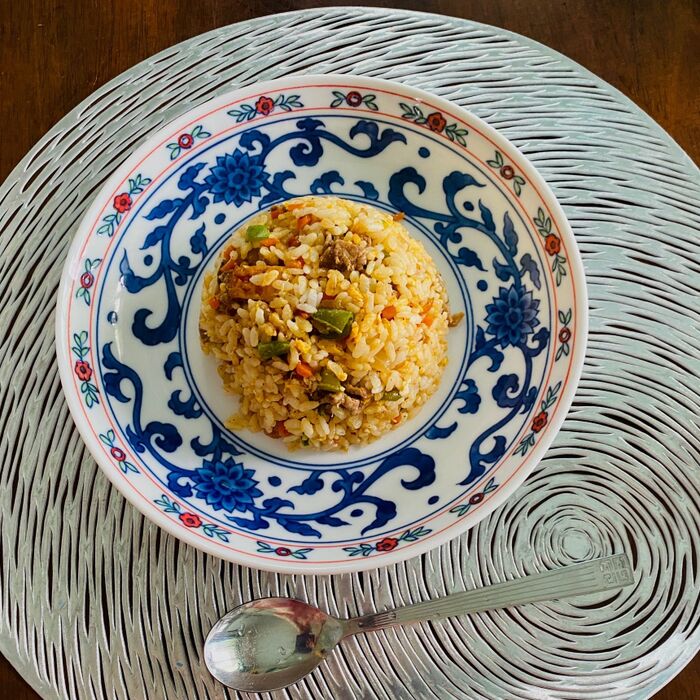 チャーハンを盛り付ける時はご飯茶碗にひっくり返して盛り付けておくと、喜んでもらえますよ。