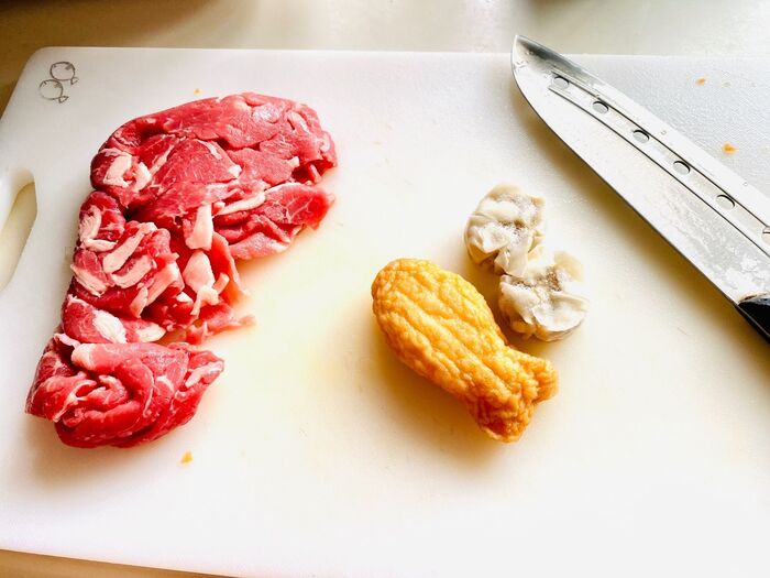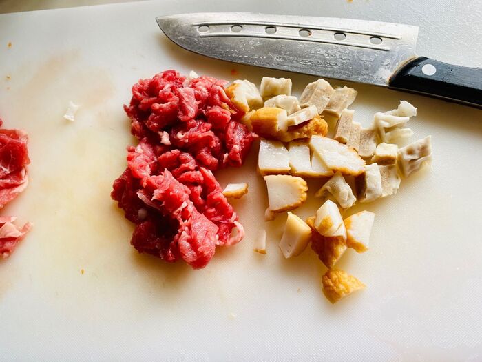 ①牛こま切れ肉(または、豚こま肉)を細かく切ります。シューマイ、揚げかまぼこを細かくカットします。