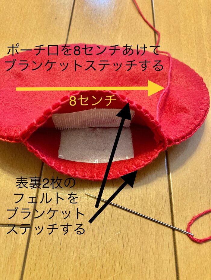 ポーチ口を8センチぐらい開けて、4枚のフェルトを、ブランケットステッチで、周りをぐるりと縫い合わせていきます。