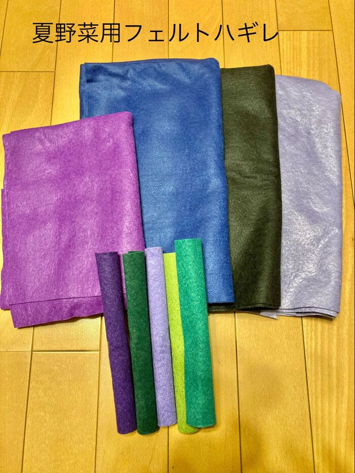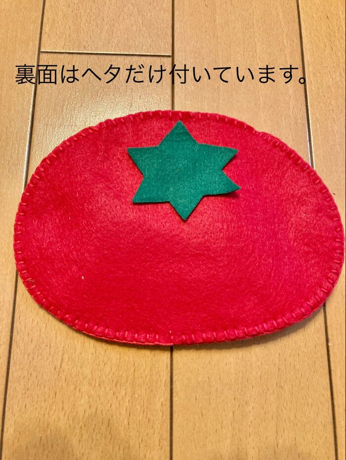 トマト本体用のフェルトを4枚カットし、ヘタ用の緑を2枚、ピンクフェルトは口用1枚、ほっぺ用2枚をそれぞれカットします。