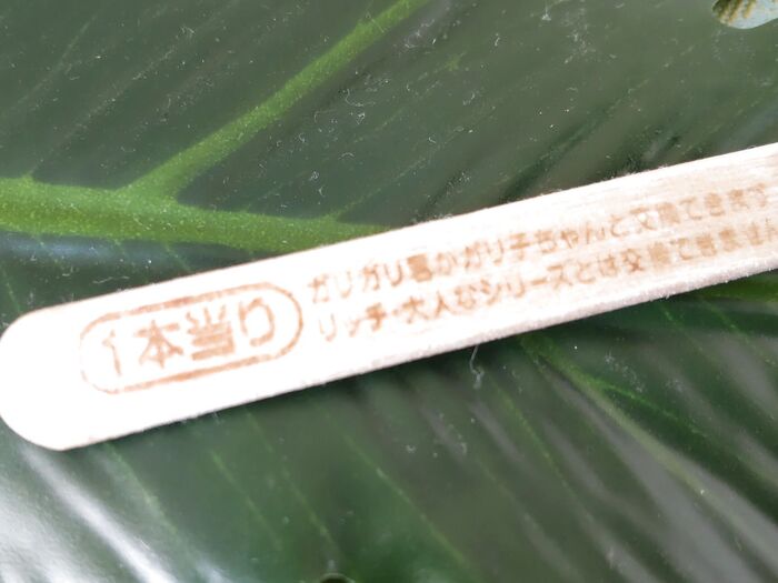 当たりはね、スティック部分にこんなふうに書かれているんですよ。当たりって、やっぱりおめでたい感じがして嬉しいんですよね。