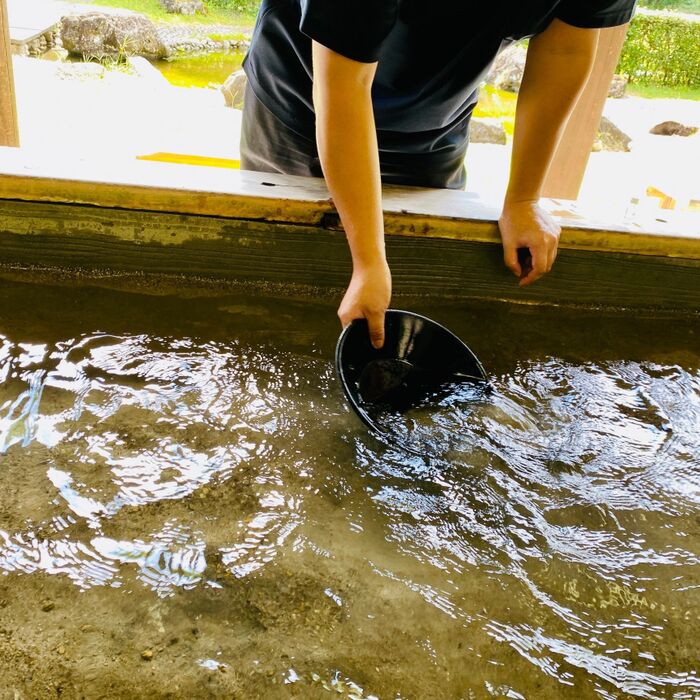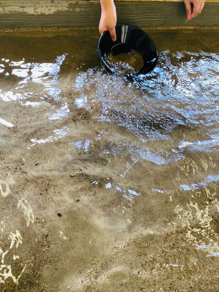 砂金は重いので、なるべく底から掬い上げて水で回しながら、浮き上がったところを狙いますよ。