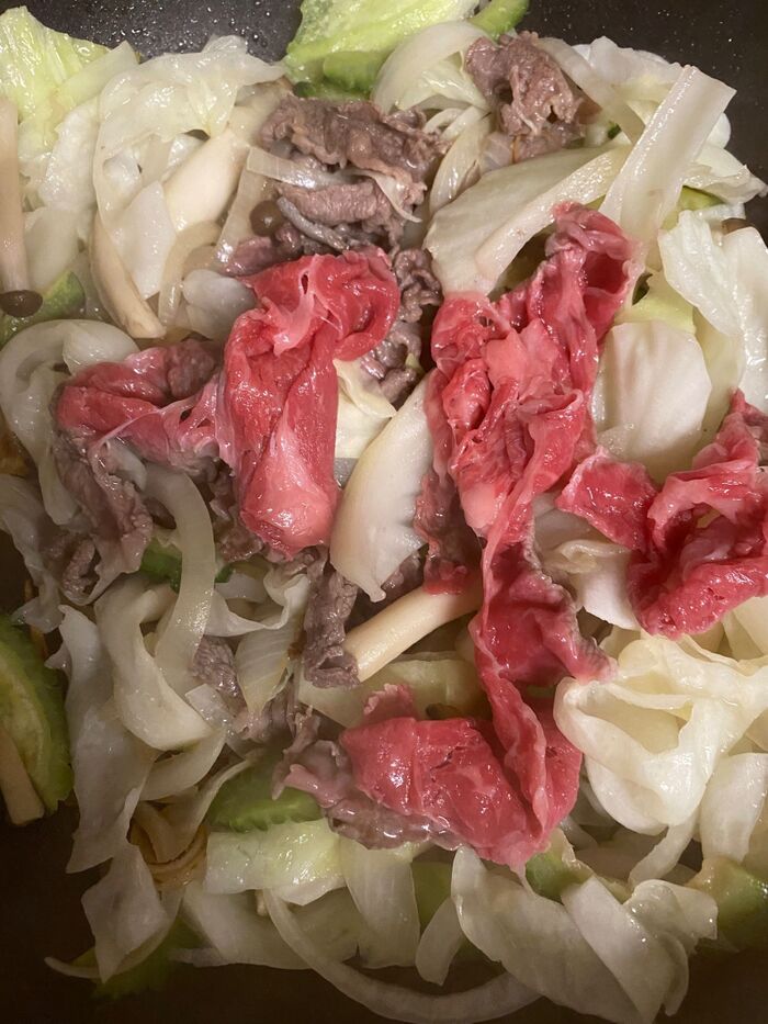 短冊切りにしたキャベツ、牛肉を入れよく炒めます。