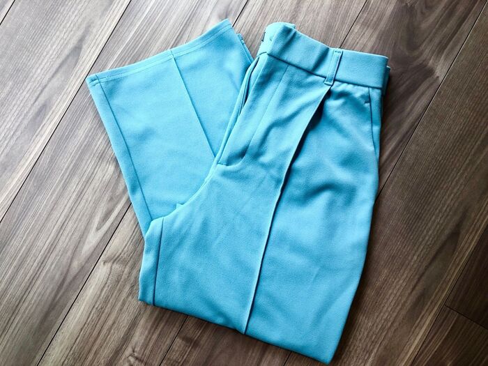 その際に紹介したのがこちらのターコイズブルーが爽やかなカットソースラックス。