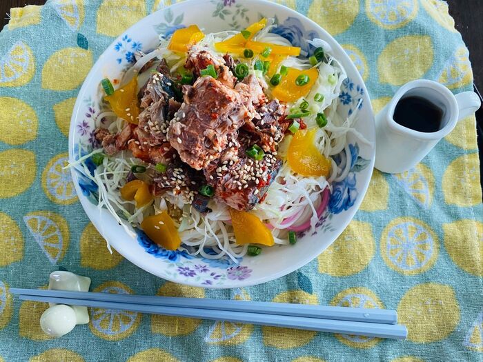 よく水気を切って冷やしておいた素麺を器に盛り付けます。