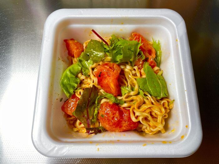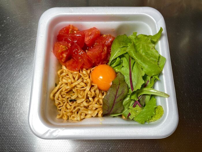 トマトの酸味と葉物でかなりサッパリだから、【追い卵黄】で元の味に馴染ませる。