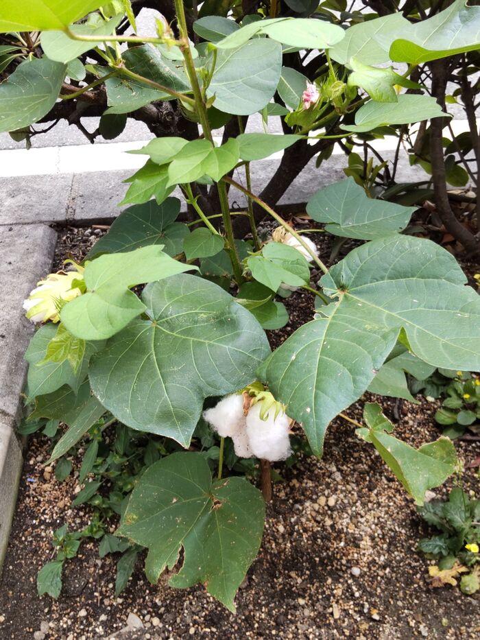 わたの植物にも色々種類があるそうですが、白ワタの種類は、結実後の秋に果実が開きやすく、このような白いコットンボールを楽しむことができるようです。