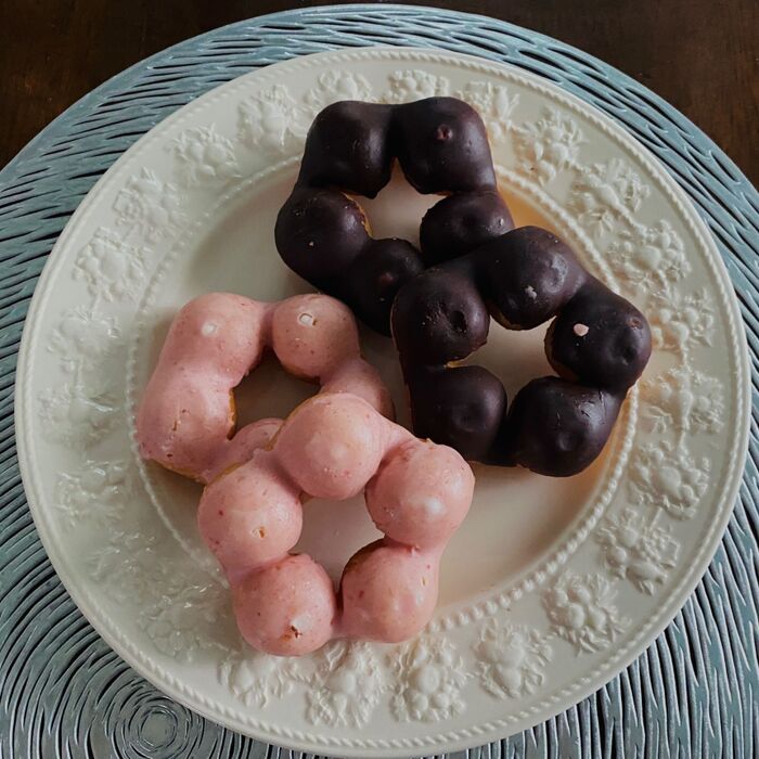 丸いコロコロドーナツが5個ポンデリング風になったチョコ味、ストロベリー味の2種類入っています。