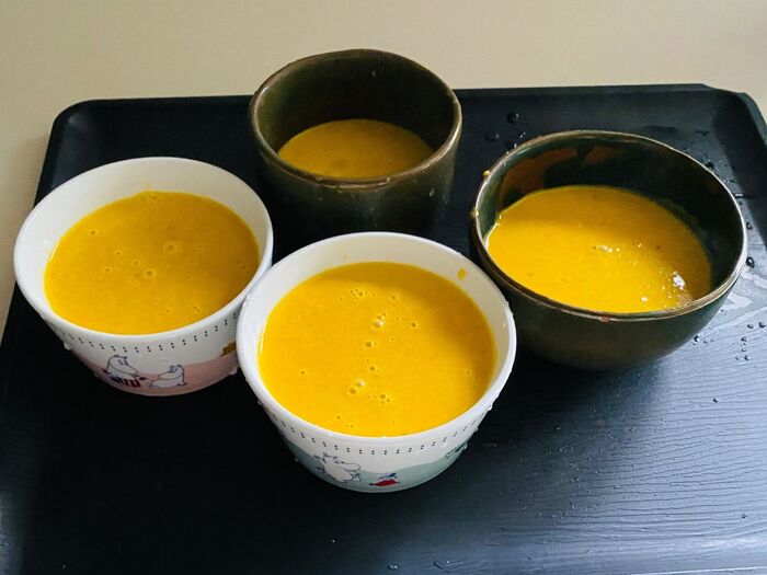 ①かぼちゃは種をとり、柔らかくなるまで茹でます。