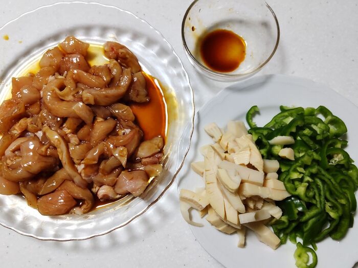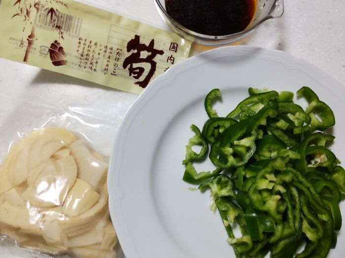 ①ピーマンは縦半分に切ってへたと種を除いて横細切りにする。たけのこは5cm長さの細切りにし、さっとゆでて水けをきる。