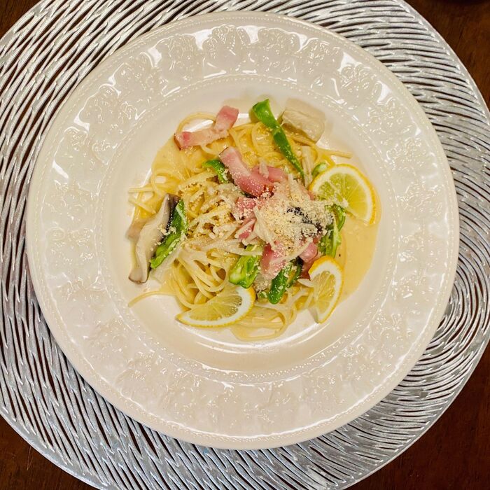 パスタはたっぷりのお湯が沸騰したら塩をひとつまみ入れ、お好みの固さに茹で、水気を切ってオリーブオイルを入れて絡めておきます。