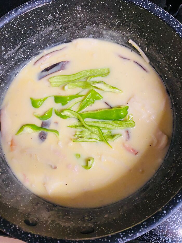 ピーマンは種などを取り除き、せん切りにして入れます。