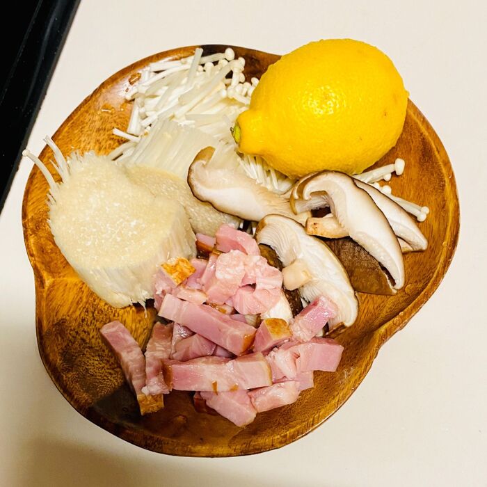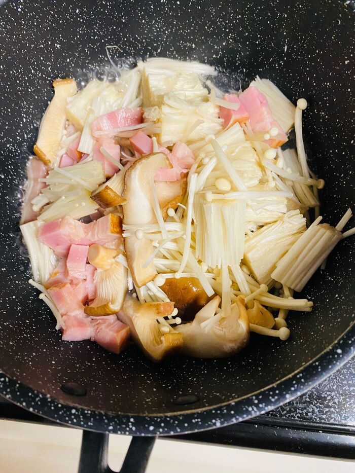 石づきをとって3cmぐらいの長さに切ったえのき、椎茸、短冊切りにしたベーコンを入れ炒めます。
