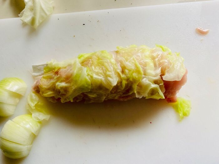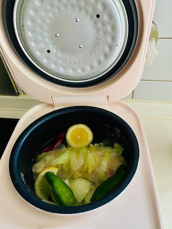 炊飯器に入れ、玉ねぎ(皮を剥いて櫛形切りします)、ピーマン(タネをとり半分に切ります)、キャベツの芯、レモンの輪切り、赤南蛮を入れます。