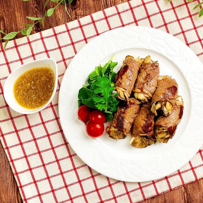 秋の味覚の一つである旨味たっぷりの舞茸に、コク深い牛肉を巻いた一品。ニンニクの効いた甘辛い玉ねぎソースが絡みご飯が進みます。