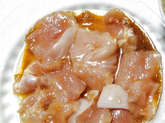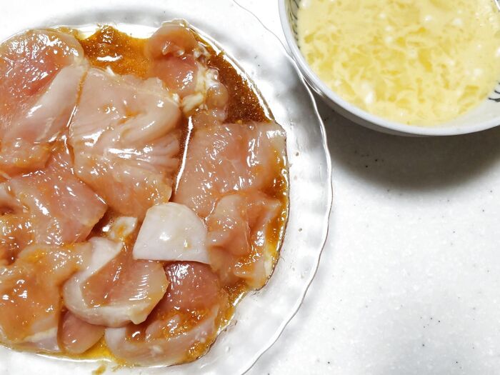 ①鶏肉は、3つに切り分けて1cm厚さのそぎ切りにする。ボウルに入れ、Aを加えてもみ込んで15分おく。
