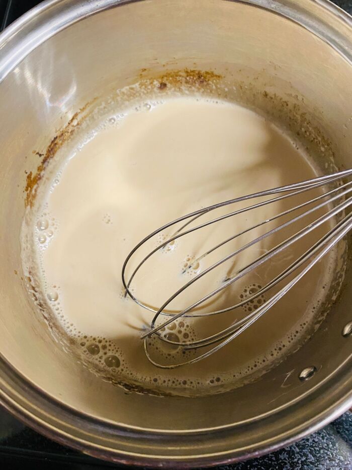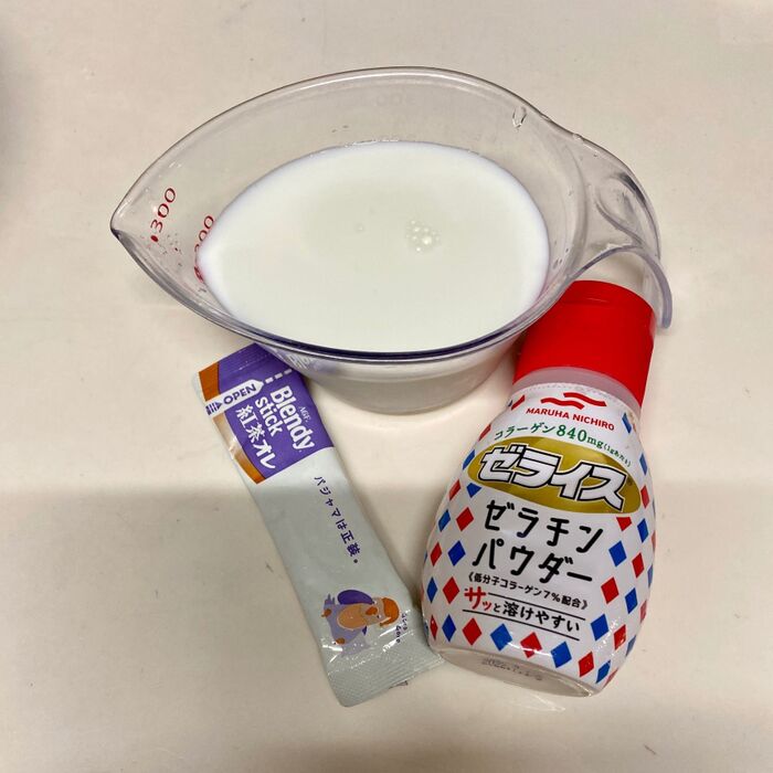 小鍋にステイック紅茶オレ、ゼラチン(ゼライス)、牛乳を入れ煮溶かします。