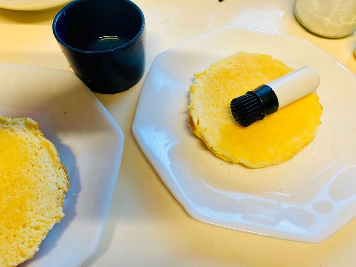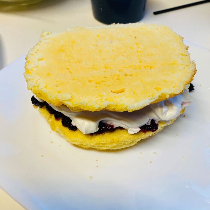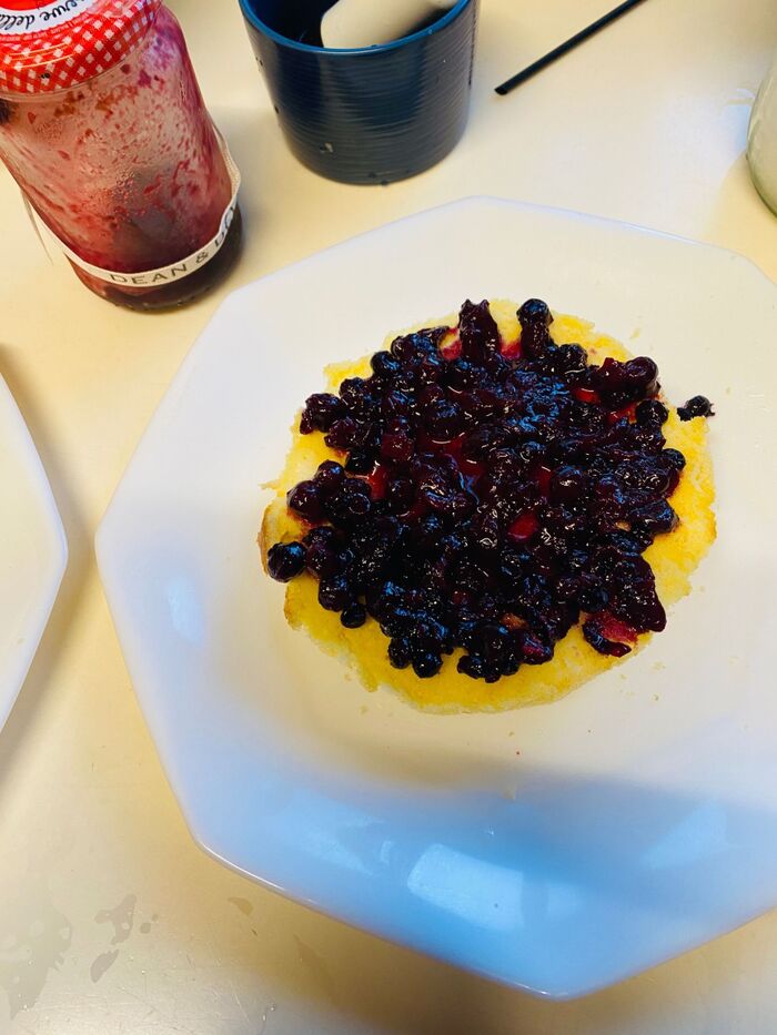 片側のケーキに自家製ブルーベリージャムを塗りました。