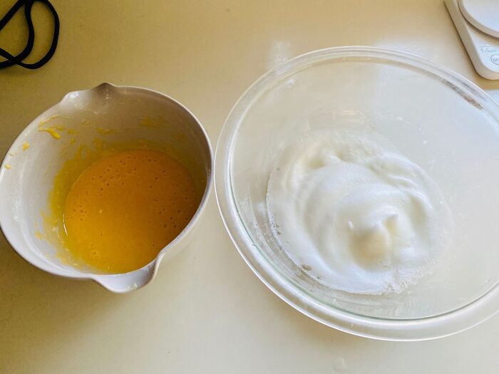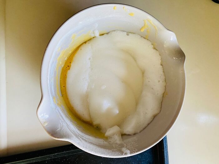 そこに、角が立つまでよく撹拌した卵白を加え、さっくりさっくり混ぜます。