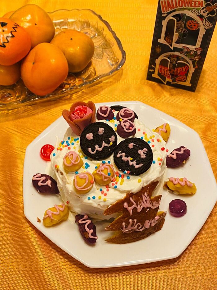 ケーキの凸型には、チョコペンでHalloweenと描き、プレートを作り飾りました。