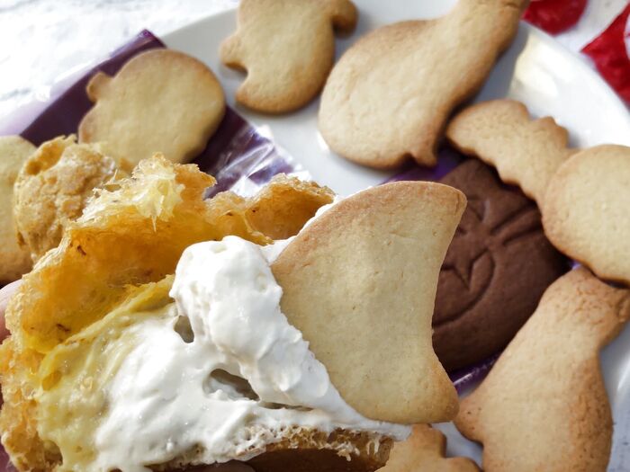 ホイップクリームや焼き芋ペーストのカスタードクリームを別々につけて食べても、楽しく美味しいです。