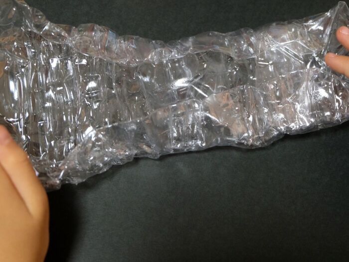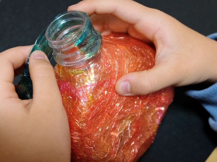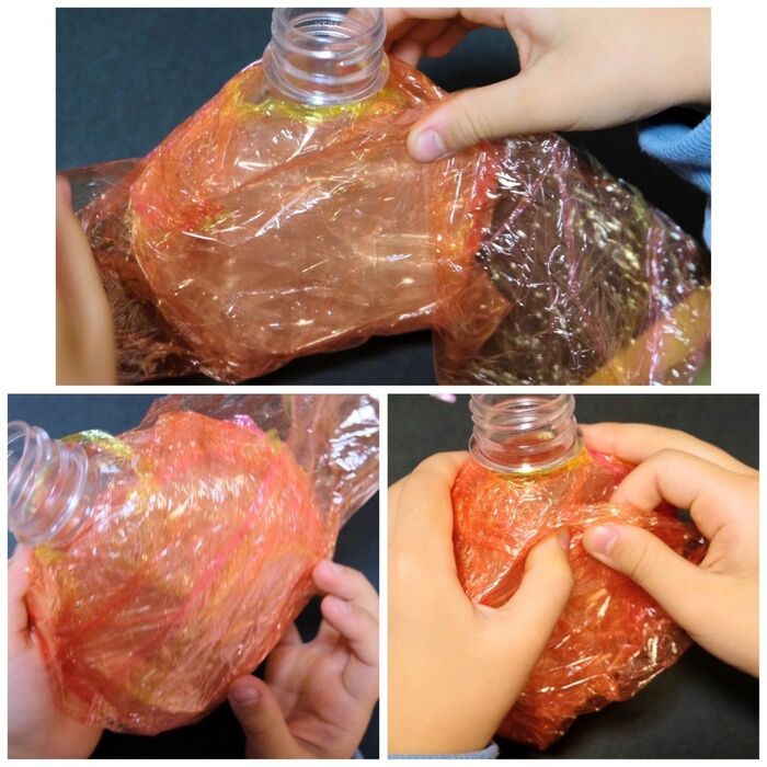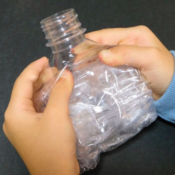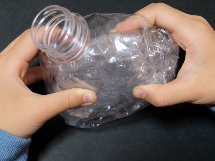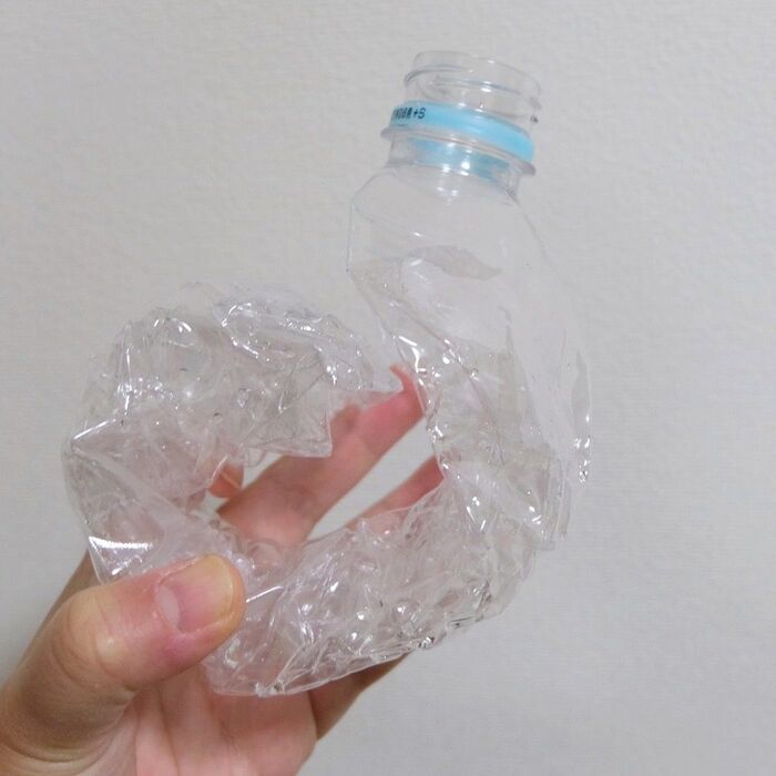 サントリー天然水のペットボトルは、つぶしやすいので、子どもでもムリなく形が作れました。