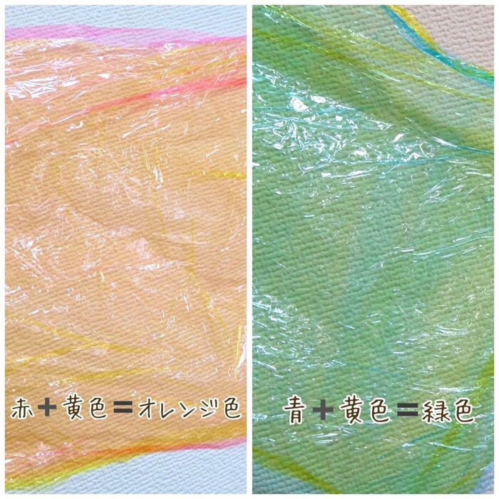 赤と青と黄色があれば、重ねて緑色、オレンジ色、紫色、茶色もできるので、色の勉強にもなりそう。
